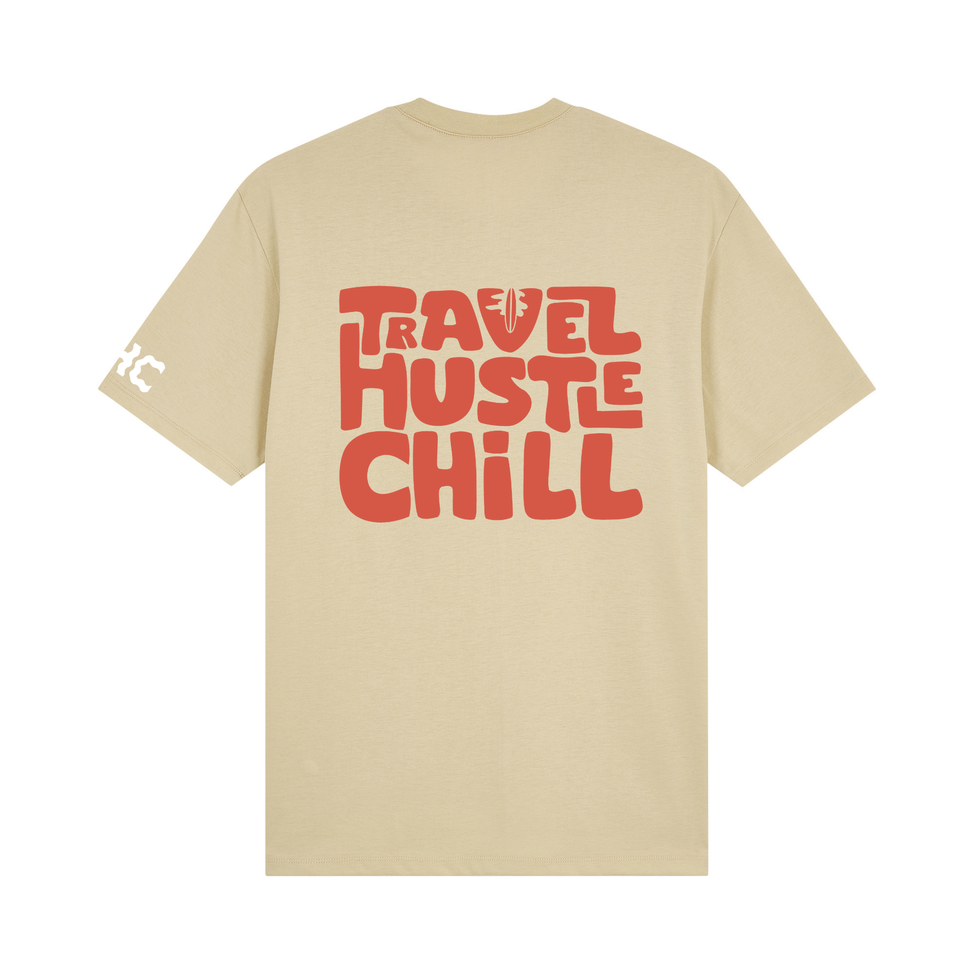 This beige oversized tee features our eye-catching RIDE THE WAVE graphic on the front, showcasing a surfer girl doing her thing. Being strong, calm, and unstoppable out on the waves. On the back, you’ll find our Travel Hustle Chill 2nd Edition emblem, marking this piece as part of our new collection.